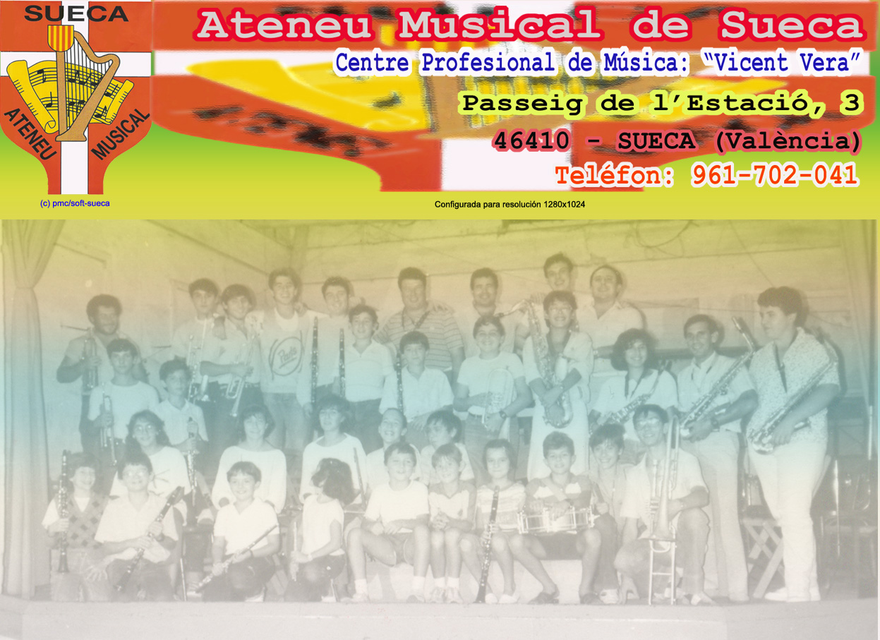 La Banda de la Sociedad Ateneo Musical de Sueca, se funda al año 1982, por un grupo de gente con inquietudes musicales, realizando sus primeros ensayos al Teatro de los "Porxets", y con una plantilla muy joven, acude a numerosos festivales y actos públicos. A las postrimerías de 1985, se realiza el acto de presentación de la bandera de la Sociedad. En Abril de 1987 y en el Teatro Principal de Valencia participa por primera vez, en el certamen de Bandas de Música de la Diputación, obteniendo el primer premio de la Tercera Sección, así como el segundo premio de la tercera Sección del IX Certamen de bandas de música de la Comunidad Valenciana , inscribiéndose en años sucesivos al Certamen internacional de Bandas de Música de Valencia donde obtiene premios tanto en la Segunda como en la Tercera Sección. Participa invitada los actos de presentación de la mascota de los Juegos Olímpicos de Barcelona, recibiendo la felicitación personal de su diseñador Javier Mariscal. En el año 1997, acude con otras sociedades musicales a un homenaje a Joan Fuster que dirigido por Carles Santos, se realiza a la plaza de Toros de Valencia También participa al Festival Internacional de 7 Bandas Amadoras de Lourdes (Portugal) obteniendo un gran éxito, realizando dos"bis". En el año 1999, obtiene el 2. premio también de la Tercera Sección en el Certamen Internacional del Ayuntamiento de Valenciano, el primero de la segunda sección de la Diputación , y además obtiene el segundo de la segunda sección del Certamen de Bandas de de la Comunidad Valenciana , siendo invitada al V Festival de Bandas de la Falla Avda. Giorgeta-Roig de Corella de Valencia, donde participa con sociedades musicales de renombre como la Banda Primitiva de Llíria y la Unión Musical de Villar del Arzobispo. El año 2001 y en le homenajeo que la ciudad de Sueca le tributa a Antonio Puchades, estreno e interpreta un pasodoble que lleva su nombre. En el año 2003, participa en el Festival "el Alcudia 2003" junto a la Philarmónica Alcudiana y la Unión Musical de Montserrat. También ha colaborado con el Valencia CF dos veces animando los prolegómenos de los partidos y han collaborando con ella, el grupo de timbales y dulzainas el Regodeo y el grupo de danzas Almogáver , Lluna Plena Teatro y el corazón "Stella Maris" Posee grabaciones realizadas en CD, como "Raíces" con la orquesta Ciudad de Sueca y otro dedicado a Josep Serrano Simeón editado por la Junta Local Fallera, así como de los últimos conciertos. En la campaña de Intercambios musicales ha realizado conciertos en todas partes de la Comunidad Valenciana con las Bandas de las Sociedades Musicales de Nules, Teulada y Rafelcofer. Han sido directores de esta agrupación : Vicent Marqués, Anselmo Villarroya, Modesto Nicolás, José Manuel Beltrán Obispal, Antonio Martínez, Juan Luis Grau, Santiago Escrivá, y Juan José Ortiz. En la actualidad su director titular es Juan Antonio Fenollar. En la actualidad, posee una plantilla de cincuenta músicos, estando nutrida por los componentes que se incorporan del Conjunto Instrumental Juvenil y la Banda Infantil. |